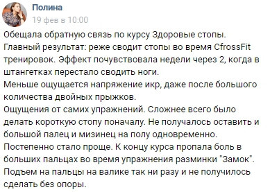 Атлеты, которым я составлял специальную гимнастику для стоп, отмечали, что переставало сводить мышцы стоп на при выполнении циклических упражнений, таких как бег, берпи, двойные прыжки"