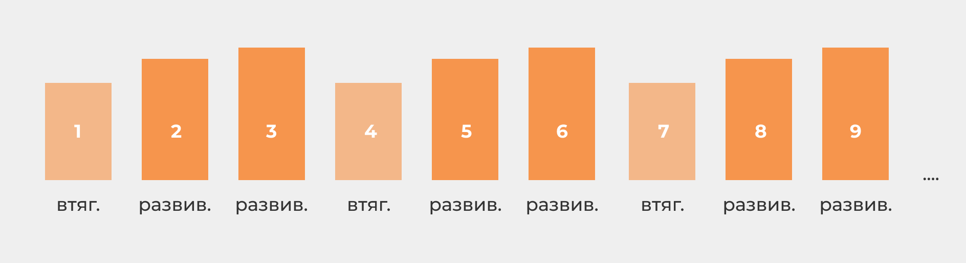 Такие циклы позволяют создавать прогрессию нагрузки, и в то же время делать ее более плавной и меньше накапливать утомление по сравнению с более длинными циклами.